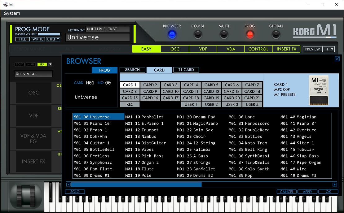 The KORG Collection M1 has many tones. As the figure below, I clicked "PROG" to enter the program mode, click "BROWSER" to display the tone browser, click "CARD" to select the M1 card, and then click "CARD 1". Now I found "M01 00 Universe".