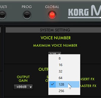 One of the great advantages of KORG Collection M1 is the large number of voices. The maximum polyphony of the M1 and T series is 16, and it has become 8 just by using two oscillators in one program. When using a combination of multiple programs, sound interruption was a major problem. With KORG Collection M1, the standard setting is 128 voices, which can be increased to 256 voices.
